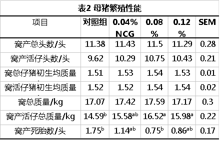 母豬產(chǎn)仔性能見(jiàn)表2。0.08%NCG組與對(duì)照組相比窩產(chǎn)活仔頭數(shù)提高了11.75 % (10.75 VS 9.62,0.05<P<0.1),窩產(chǎn)活仔初生總質(zhì)量提高了13.23 % (16.52 kg VS.14.59 kg,P<0.05),窩產(chǎn)死胎數(shù)降低了57.14% (P<0.05);0.12% NCG組與對(duì)照組相比提高了窩產(chǎn)活仔初生總質(zhì)量( P <0.05),有降低窩產(chǎn)死胎數(shù)的趨勢(shì)( O.05 < P < 0.01 )。