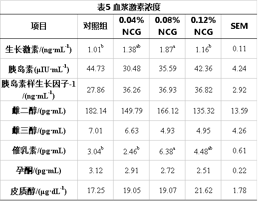由表5可知,0.08%NCG 組相對(duì)于對(duì)照組和0.12 %NCG 組提高了生長(zhǎng)激素(GH)的含量 ( P<0.05 ),0.08% NCG 組相對(duì)于對(duì)照組和 0.04 % NCG組提高了催乳素 (HPL) 的含量(P<0.05)。